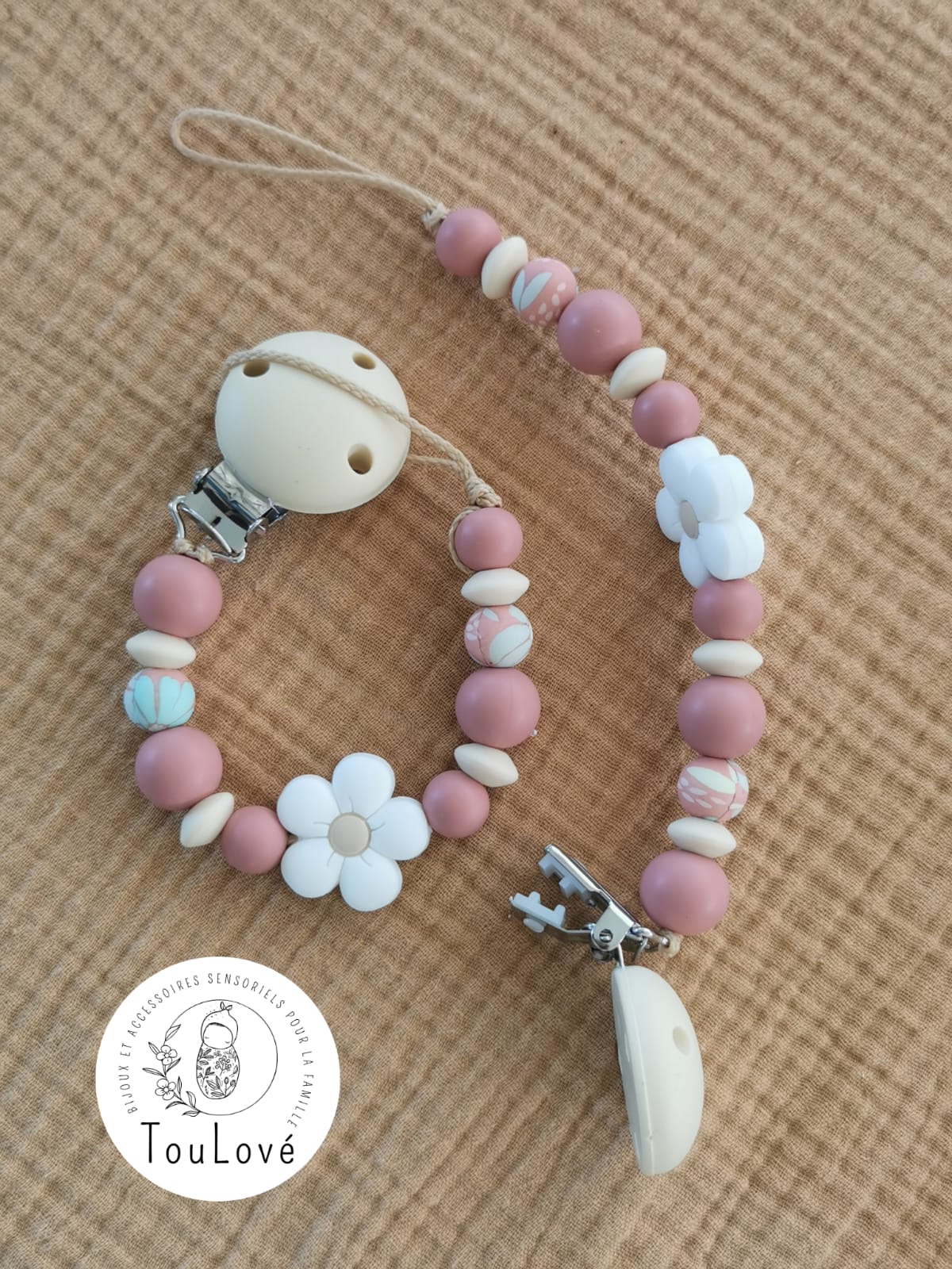 Grâce à sa pince en acier inoxydable recouverte de silicone, l’attache-tétine se fixe facilement aux vêtements. Les perles en silicone souple, aux teintes pastel, apportent un toucher agréable et un look tout en douceur.