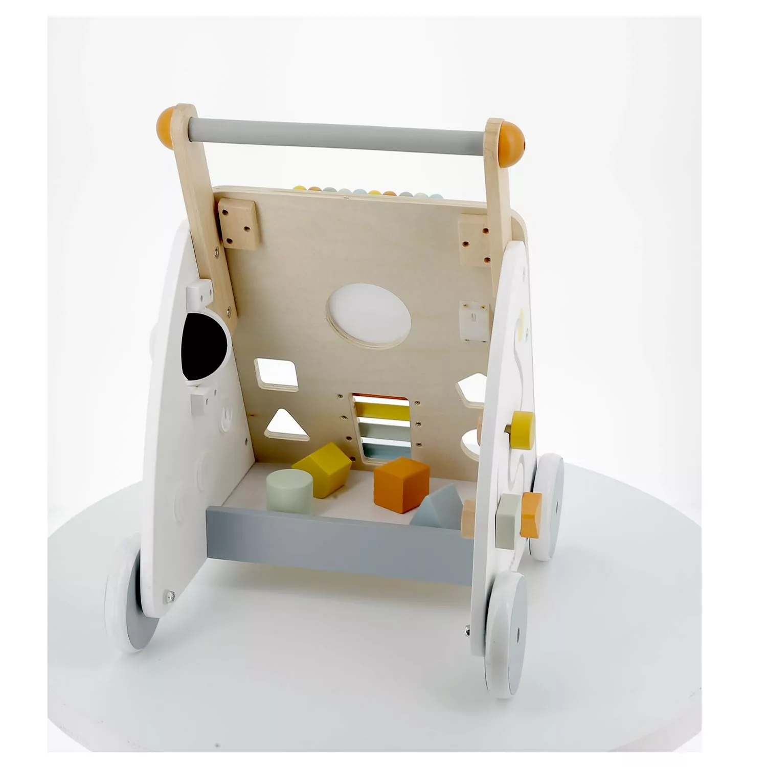 Ce joli chariot multi-activités à pousser est particulièrement adapté à l’apprentissage de la marche. Il accompagnera votre enfant en toute sécurité dès 12 mois : son frein invisible et amovible permet de bloquer les roues et de les libérer progressivement afin de maitriser la vitesse du chariot pendant l’apprentissage. En plus de la marche, votre enfant pourra tester sa motricité fine ainsi que sa dextérité avec les 9 activités ludiques proposées : boulier, boîte à formes, labyrinthe, engrenages, bouton rotatif sonore, « gratte-gratte », miroir rotatif grossissant, tambour et xylophone métal pour développer son éveil musical. Très astucieux, ce chariot d’activité est équipé d’un tapis en feutrine pour atténuer le bruit et amortir la chute des cubes. Enfin, ses roues sont silencieuses ! Si on ajoute à tout ceci, son design contemporain et ses couleurs douces, on ne peut que craquer ! On aime le bois naturel, le blanc et le gris, mis en valeur par les détails colorés des nombreuses activités de ce chariot premier âge pour bébé ! Offrir un chariot de marche multi activités en bois à bébé, c’est lui proposer un jouet deux en un robuste et plein de charme. Un jouet intemporel qui pourra se transmettre de génération en génération, et qui fera craquer toute la famille ! La collection Sweet Cocoon, ce sont des jouets premier âge aux couleurs douces, aux formes arrondies, proposant des activités de découvertes amusantes pour bébé !