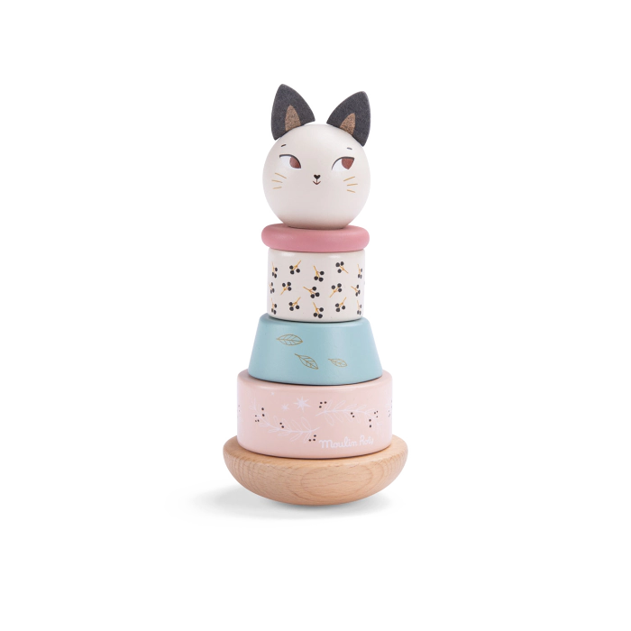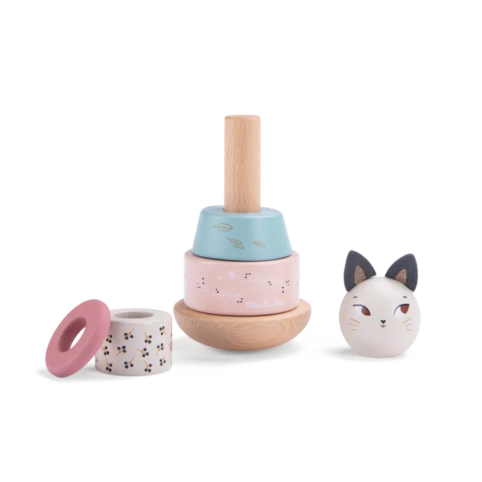 Create a listUn classique parmi les jeux en bois. Bébé devra empiler sur le culbuto, un à un les 4 anneaux aux formes et couleurs variées ainsi que la tête pour former le chat Giboulée. A monter et démonter à l’infini…
