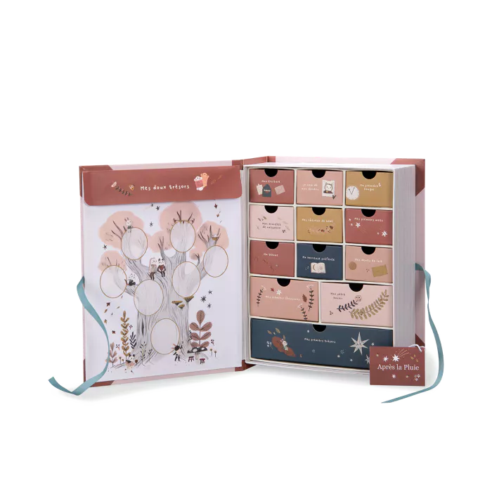 Coffret à trésors pour conserver les souvenirs de bébé dans chacun des tiroirs … Se referme avec de jolis liens et reprend les tendres illustrations des personnages de la collection Trois Petits lapins à l’intérieur comme à l’extérieur.