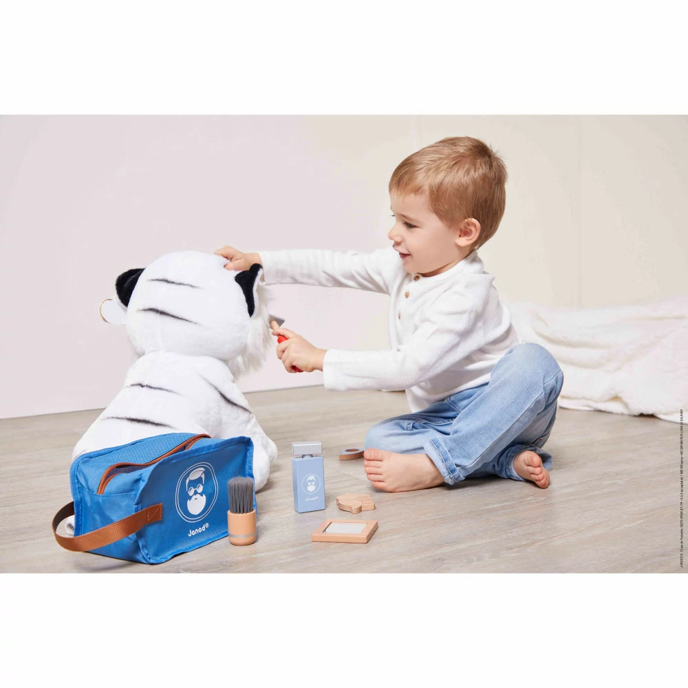 Leur propre mallette de rasage ! Les enfants adorent imiter les plus grands qui se préparent avec leur kit de rasage, pour être tout beau ! Ce set contient toute une panoplie d’accessoires stylés et imitant à la perfection ceux du coiffeur/barbier : un blaireau et sa mousse à raser pour le visage, un rasoir, un peigne pour la barbe ou les cheveux, des ciseaux trop rigolos, un miroir pour s’admirer et un parfum pour la touche finale ! Voilà un jouet d’imitation complet pour nos apprentis coiffeurs ! Tous les accessoires se rangent dans une sacoche très pratique pour les emporter partout. Avec ce set en bois, votre enfant à partir de 3 ans va pouvoir se familiariser avec la notion du « prendre soin de soi » de manière ludique et en utilisant ses propres accessoires. Une petite coupe ? Un rafraîchissement ? Installez-vous et laissez-vous bichonner par votre petit barbier !
