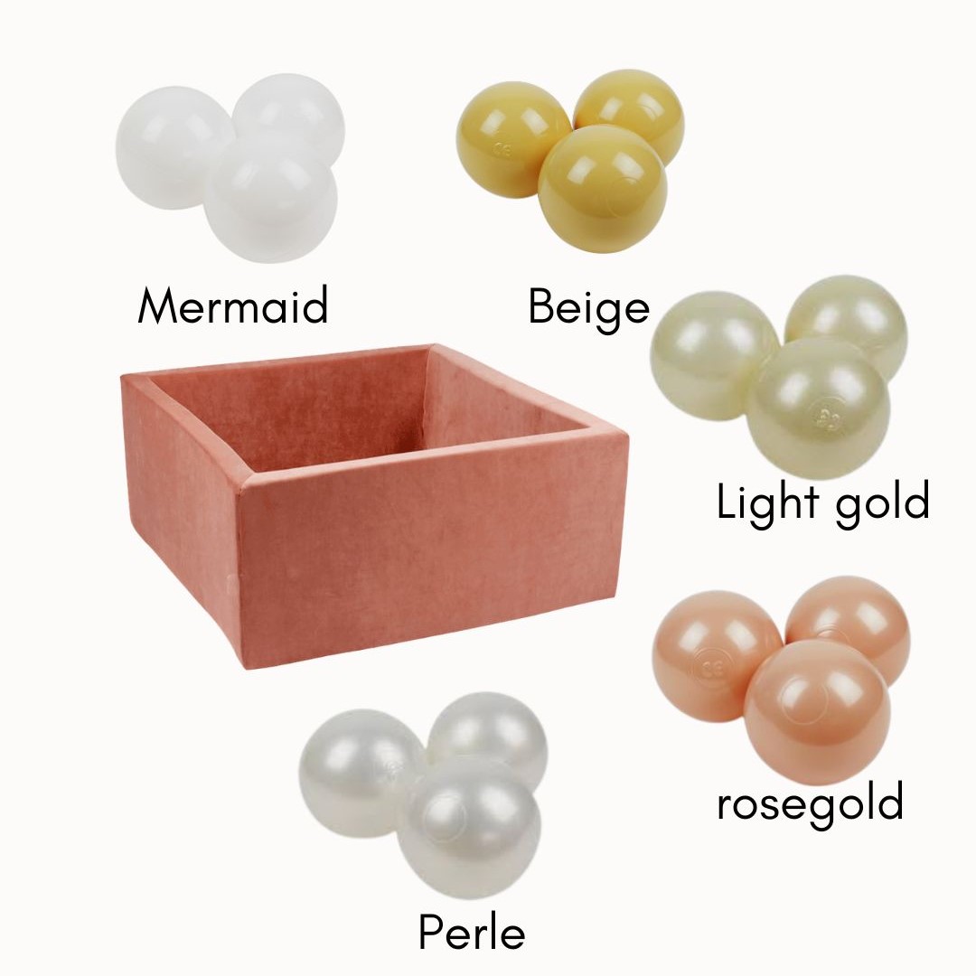 Piscine à balles carrée – Soft Velvet rust – 110x110x40 + 300 balles beige, lightgold, mermaid, perle, rosegold, blanc – MOJE
