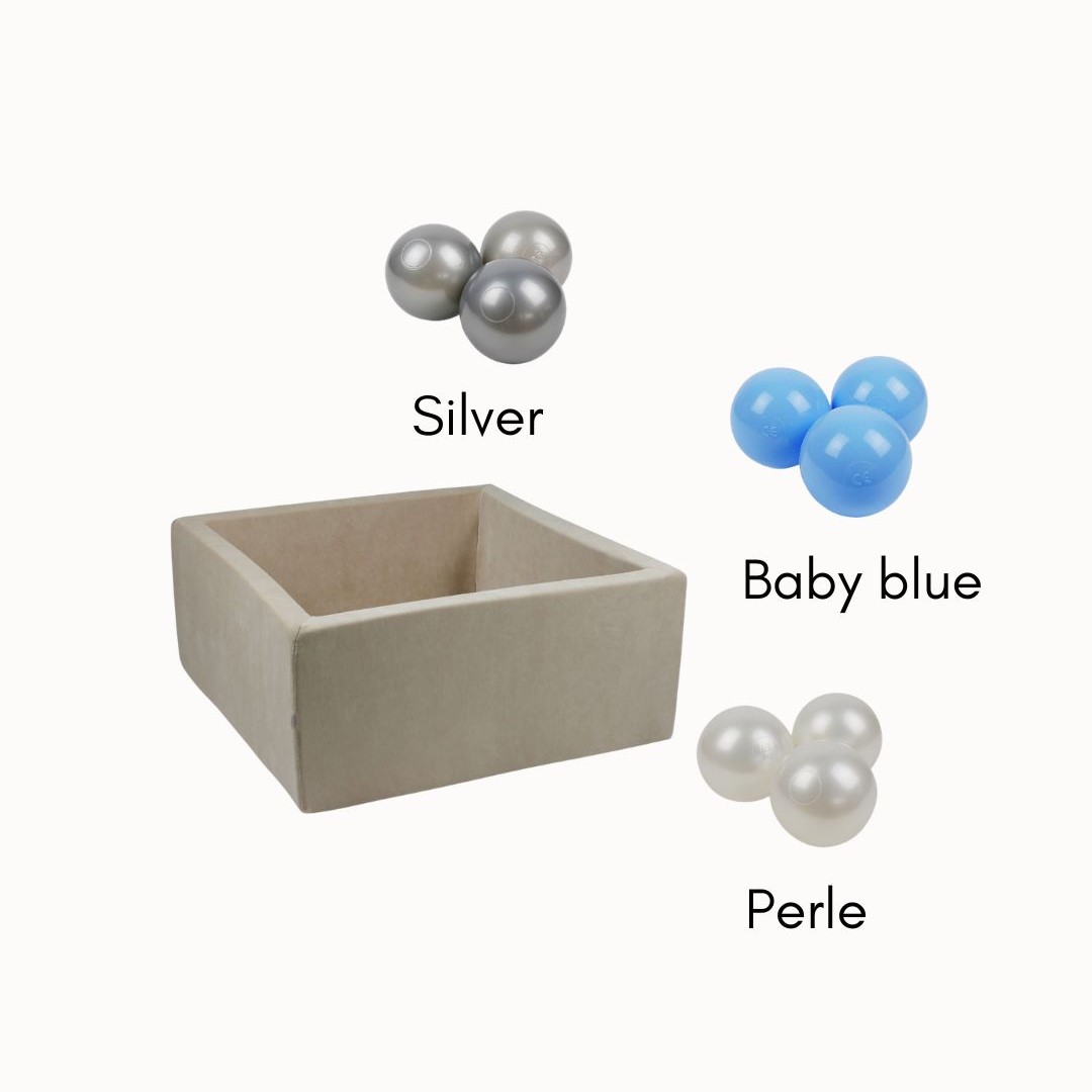 Piscine à balles carrée – Soft Velvet beige – 110x110x40 + 350 balles silver, baby blue et perle – MOJE
