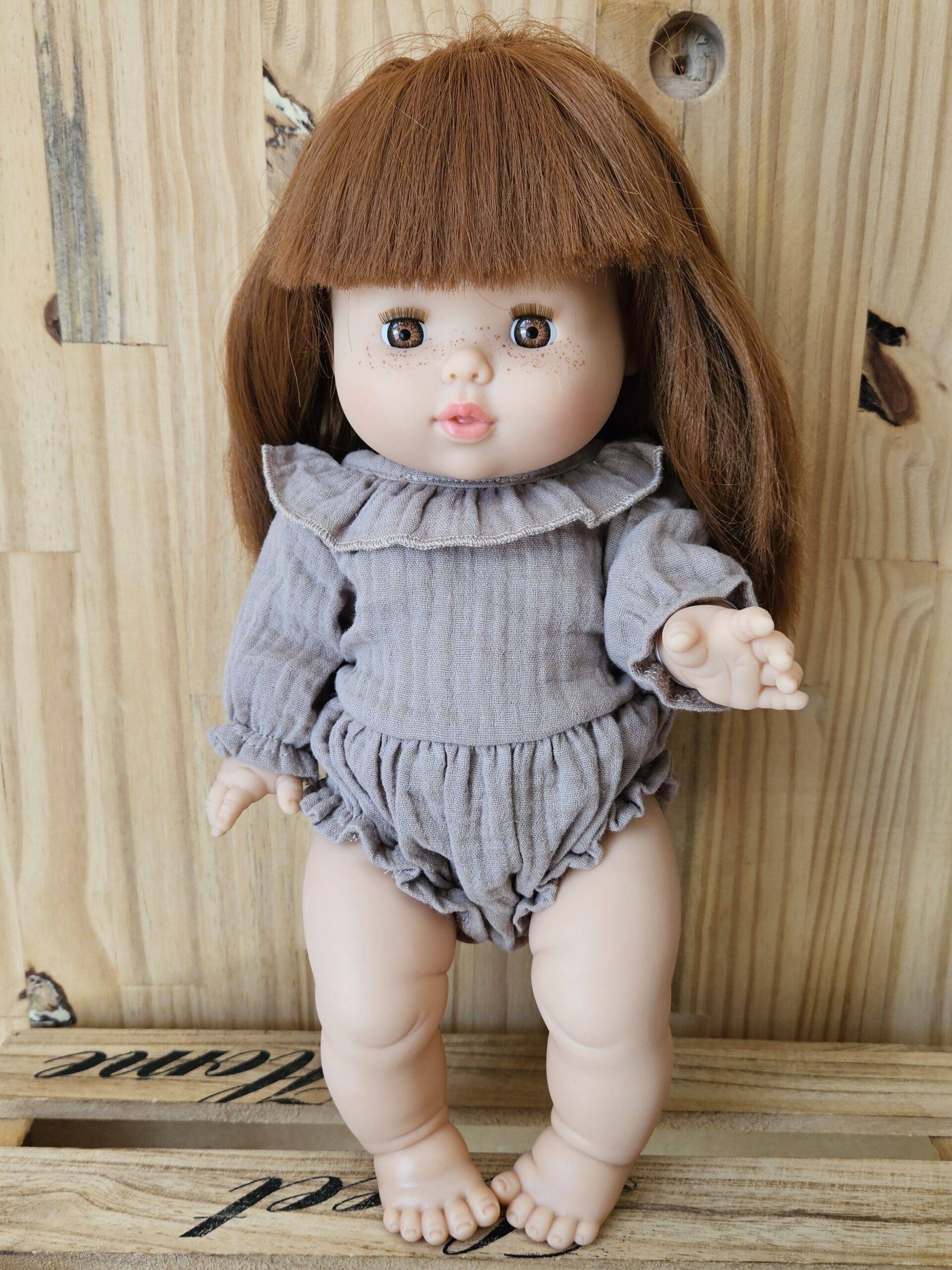 Poupée Ambre 34cm – Barboteuse Léonore à manches longues en gaze de coton moka – Minikane
