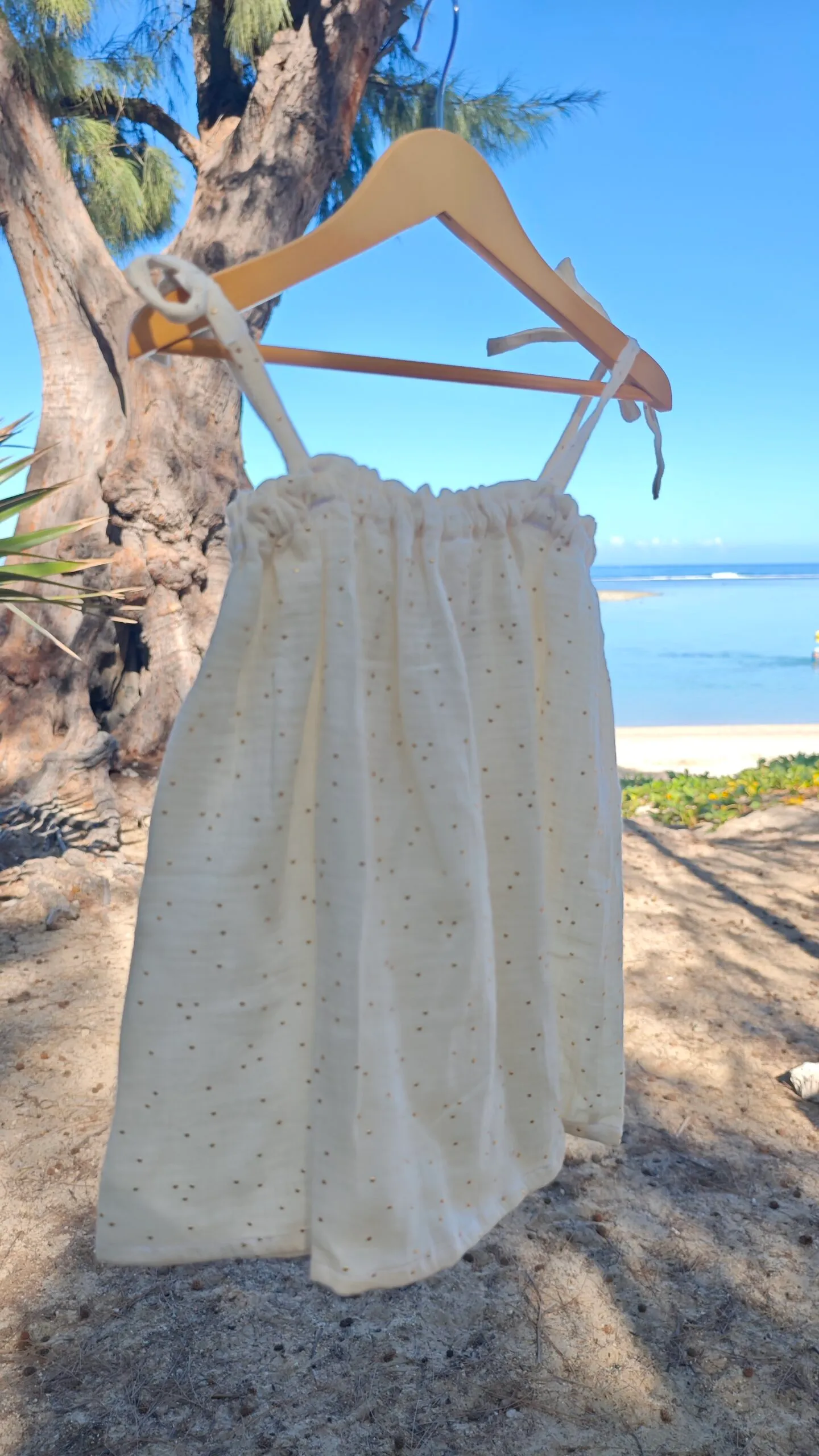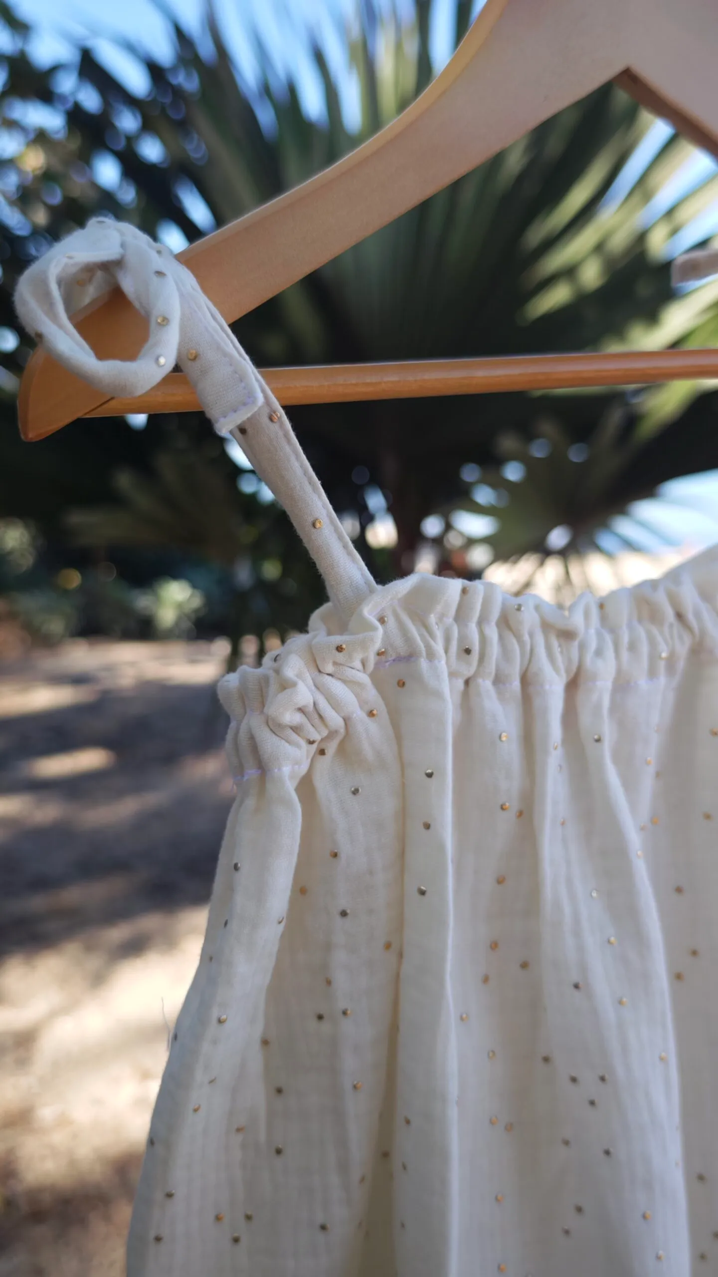 Cette double gaze écru aux jolis pois dorés fera une pièce intemporelle du dressing de votre enfant.